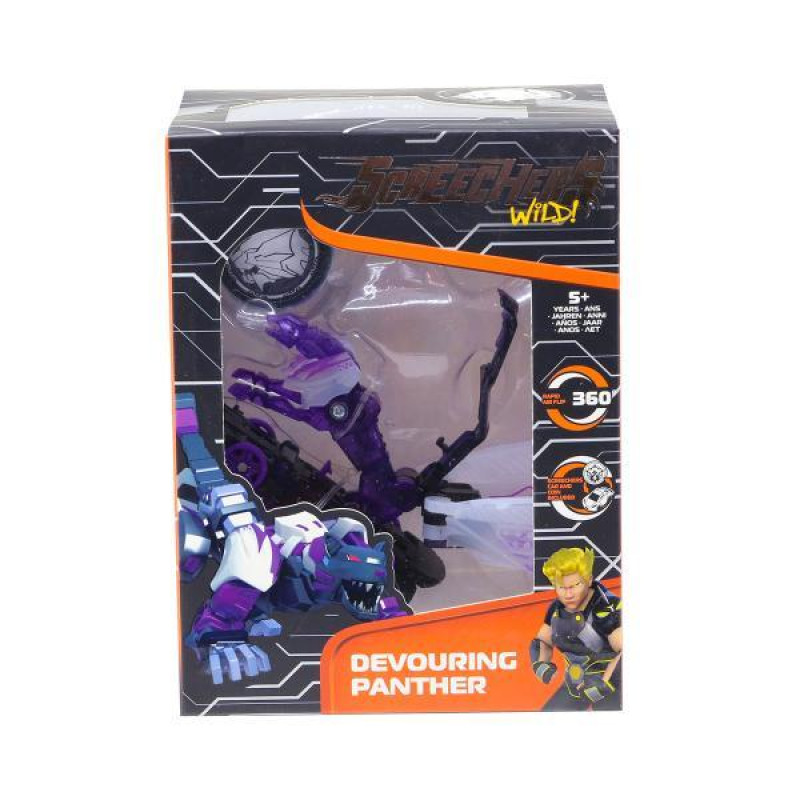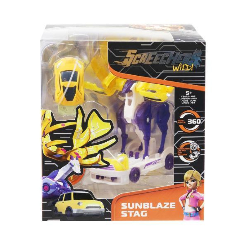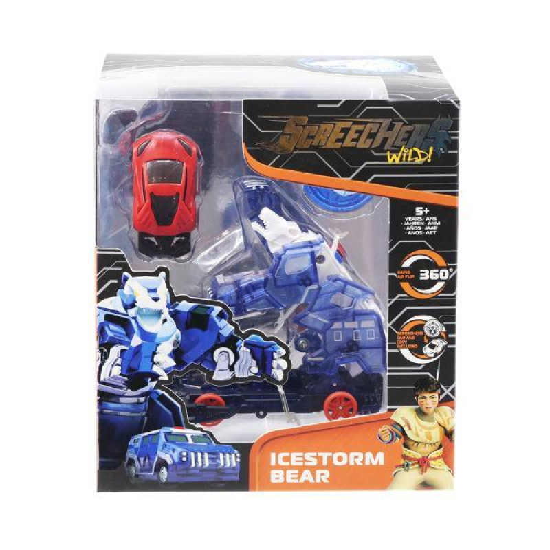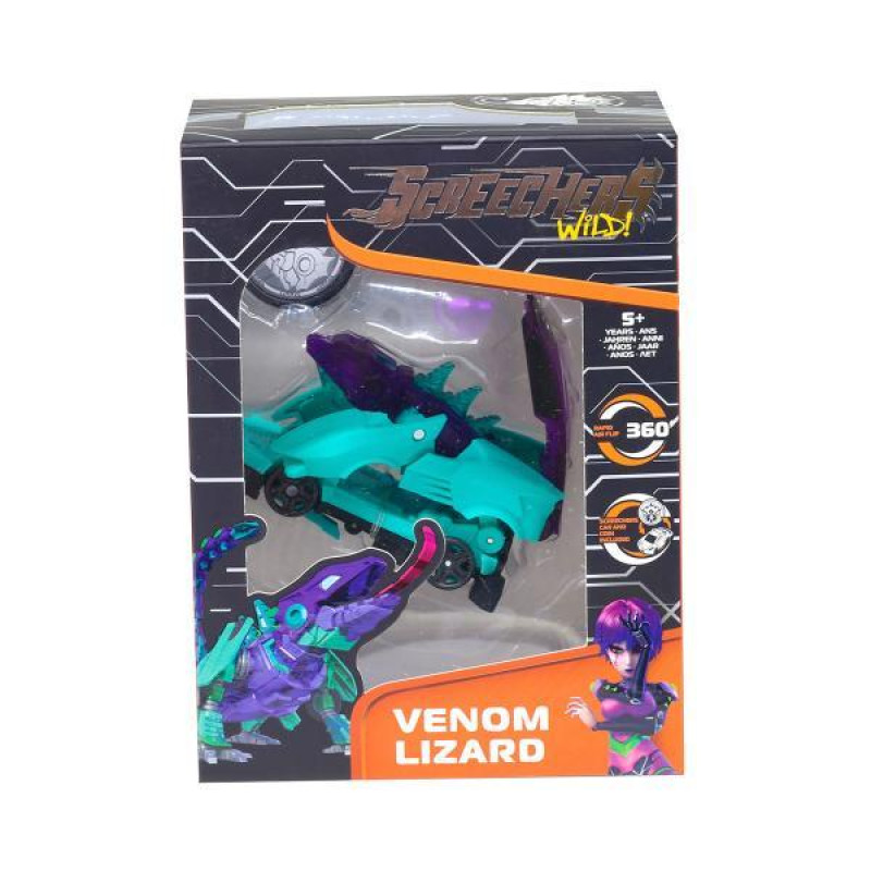 Машинка-трансформер SCREECHERS WILD!, Упаковка - картонний планшет з блістером. У комплекті: 1 машинка, 3 диски. Особливості: машина вміє виконувати сальто на 360 градусів і трансформується у дикого звіра прямо у повітрі. Необхідно запустити авто, направляючи його на диск, або навпаки - запустити ди..