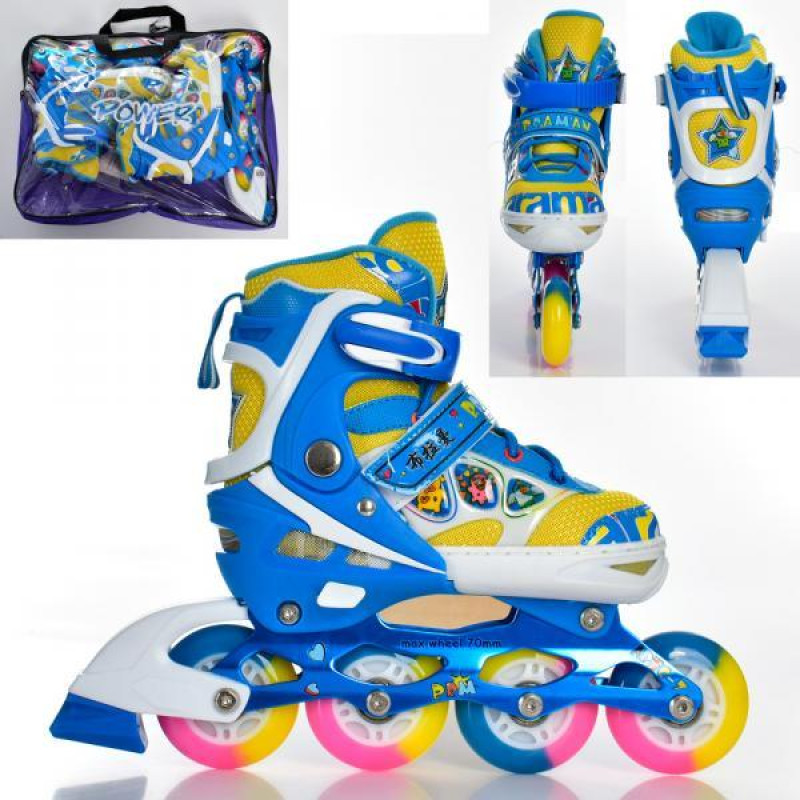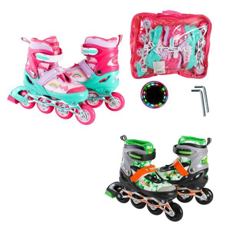 Ролики розмір 27-30 розсувні, шнур + бакля, алюм. рама, цв.ПУ, 64мм, 1 світ., комбо, зелен., в кор.34,5 * 27 * 10см..