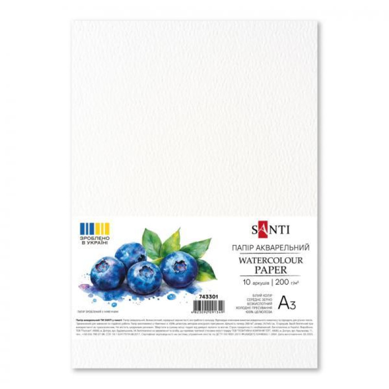 Папір для акварелі ТМ SANTI (A3) — чудовий вибір для художників будь-якого рівня. Виготовлений у Німеччині зі 100% целюлози методом холодного пресування, він має середньозернисту текстуру й білий колір, що ідеально підходить для точного передавання відтінків і насичених фарб.У наборі — 10 аркушів фо..