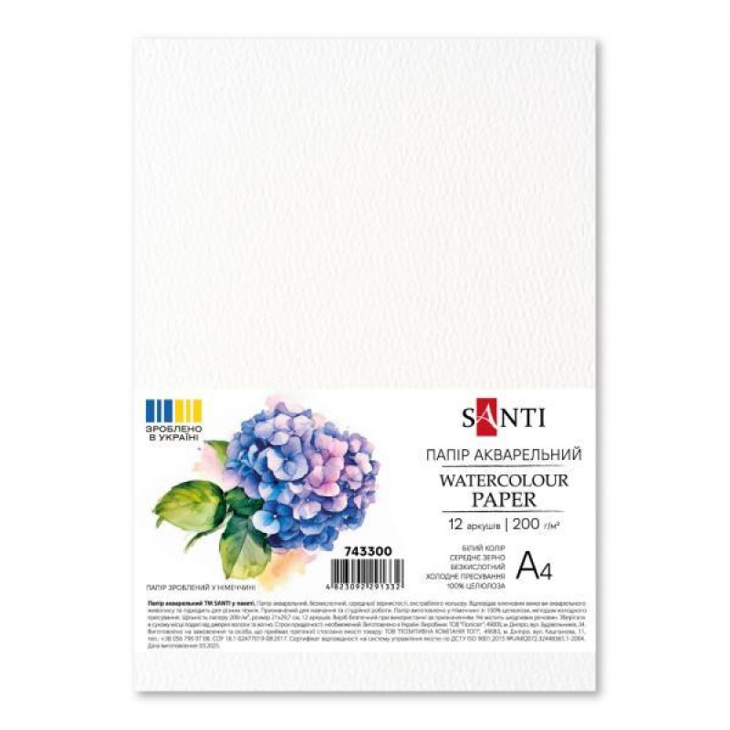 Папір для акварелі ТМ SANTI (A4) — чудовий вибір для художників будь-якого рівня. Виготовлений у Німеччині зі 100% целюлози методом холодного пресування, він має середньозернисту текстуру й білий колір, що ідеально підходить для точного передавання відтінків і насичених фарб.У наборі — 12 аркушів фо..