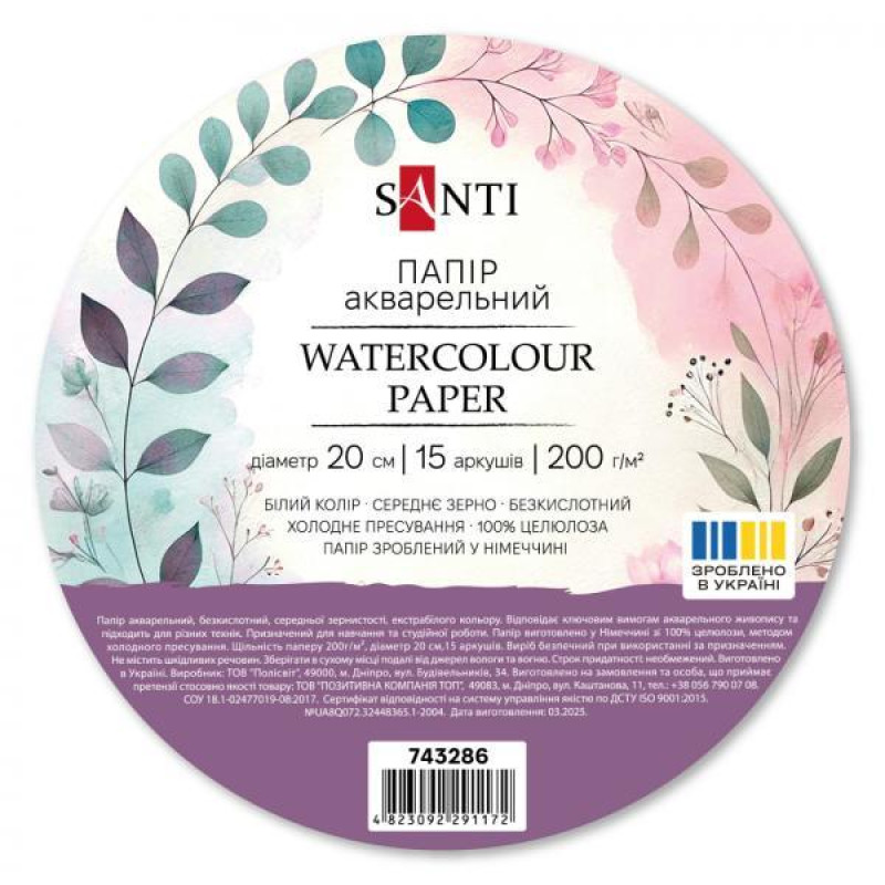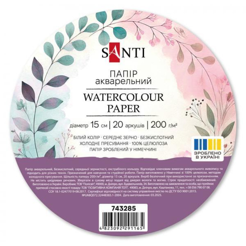 Круглий папір для акварелі ТМ SANTI (діаметр 20 см) — зручний формат для експериментів і творчості в будь-яких умовах. У наборі — 15 аркушів білого паперу щільністю 200 г/м2, виготовлених у Німеччині зі 100% целюлози методом холодного пресування.Середньозерниста текстура забезпечує цікаві ефекти у р..