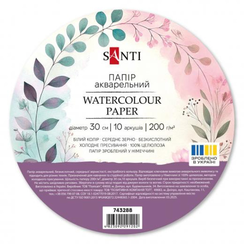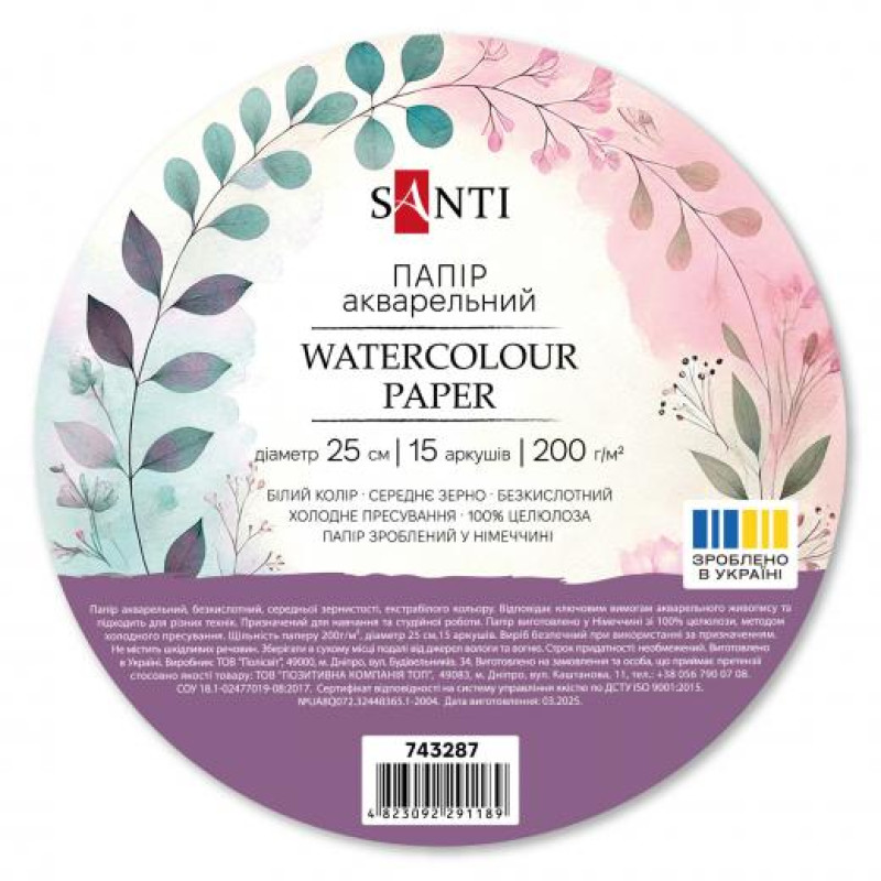 Круглий папір для акварелі ТМ SANTI (діаметр 25 см) — зручний формат для експериментів і творчості в будь-яких умовах. У наборі — 15 аркушів білого паперу щільністю 200 г/м2, виготовлених у Німеччині зі 100% целюлози методом холодного пресування.Середньозерниста текстура забезпечує цікаві ефекти у р..