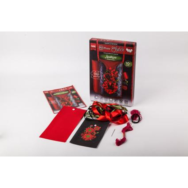 схема-заготівля з малюнком вишивкою на полотні, із встановленою кнопкою; - полотно для зворотного боку чохла із встановленою кнопкою; - Комплект ниток муліне; - голка; - покрокова інструкція; - Комплект бісеру; - Комплект атласних стрічок |