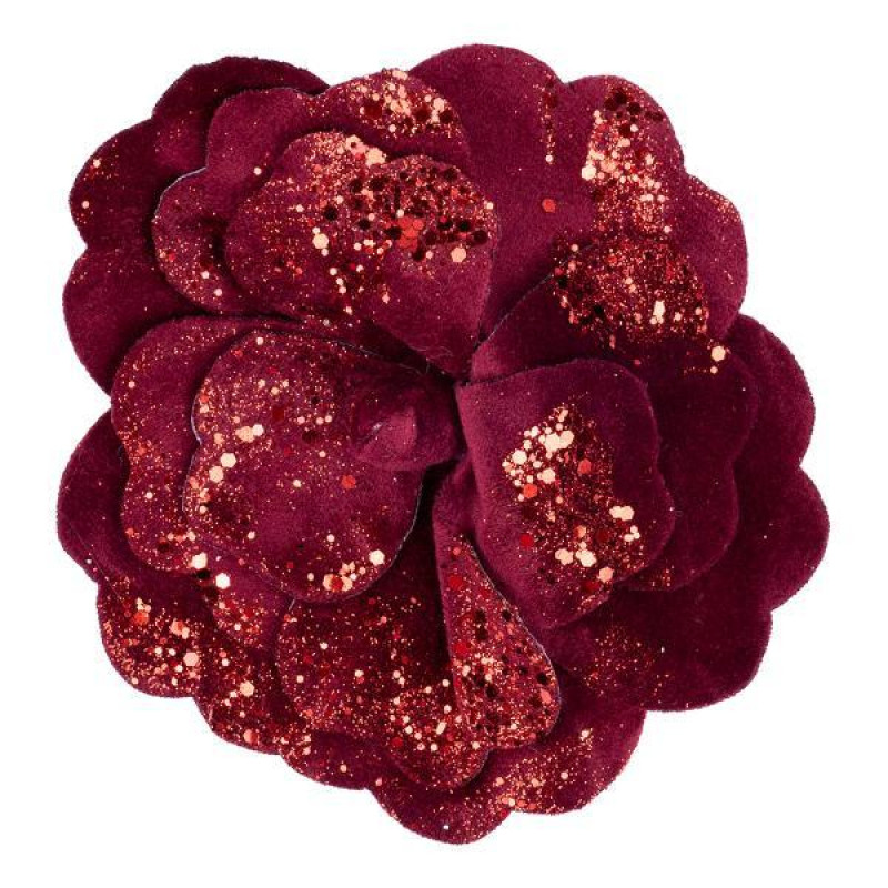 Штучна троянда, темно-червоного кольору - прекрасна та ніжна квітка, використовується для декорування новорічної хвої, а також у святкових композиціях та ікебанах. Діаметр квітки: 12 см. Матеріал: оксамитова тканина, глітер, металевий кліп...