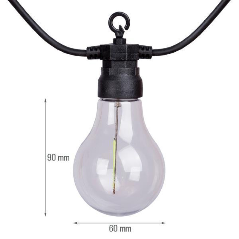 Електрогірлянда-ретро використовується для інтер‘єрного та вуличного декорування. Колір лампочок, що світяться — багатобарвний; діаметр - 60 мм; висота — 90 мм. Кількість лампочок: 10 шт.. Ступінь захисту електрогірлянди IP 44. Довжина проводу: 8 м (5 м - секція з лампочками, 3 м - довжина кабелю). Склад: пластик, електричний провід. Джерело живлення: від мережі (220-240 В, 50-60 Гц, 6 Вт). Наприкінці електрогірлянди є роз‘єм для з‘єднання, який дозволяє створювати електрогірлянди довільної довжини. Рекомендовано підключати не більше 3 шт..