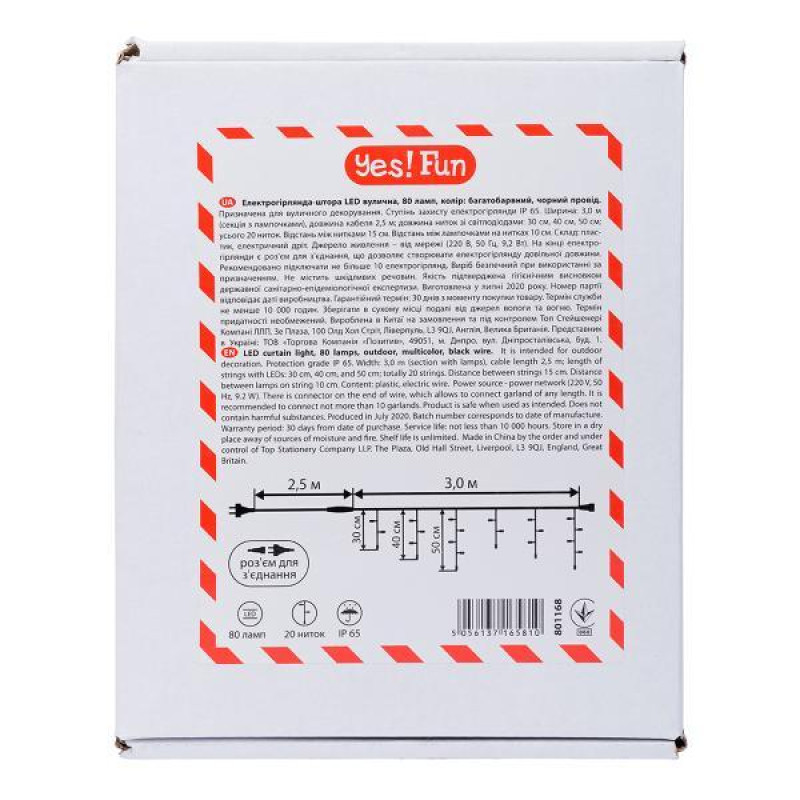 Електрогірлянди-штора використовується для вуличного декорування. Колір лампочок, що світяться - багатокольоровий, колір проводу - чорний. Кількість лампочок: 80 шт.. Відстань між лампочками: 10 см.. Довжина ниток зі світлодіодами: 30 см, 40 см, 50 см. Усього ниток: 20 шт. Ступінь захисту електрогірлянди IP 65 дозволяє розміщувати електрогірлянди на вулиці круглий рік, незалежно від погодних умов. Довжина проводу: 5,5 м (3 м - секція з лампочками, 2,5 м - довжина кабелю). Склад: пластик, електричний провід. Джерело живлення: від мережі (220 В, 50 Гц, 9,2 Вт). Наприкінці електрогірлянди є роз‘єм для з‘єднання, який дозволяє створювати електрогірлянди довільної довжини. Рекомендується з‘єднувати не більше 10 електрогірлянд.