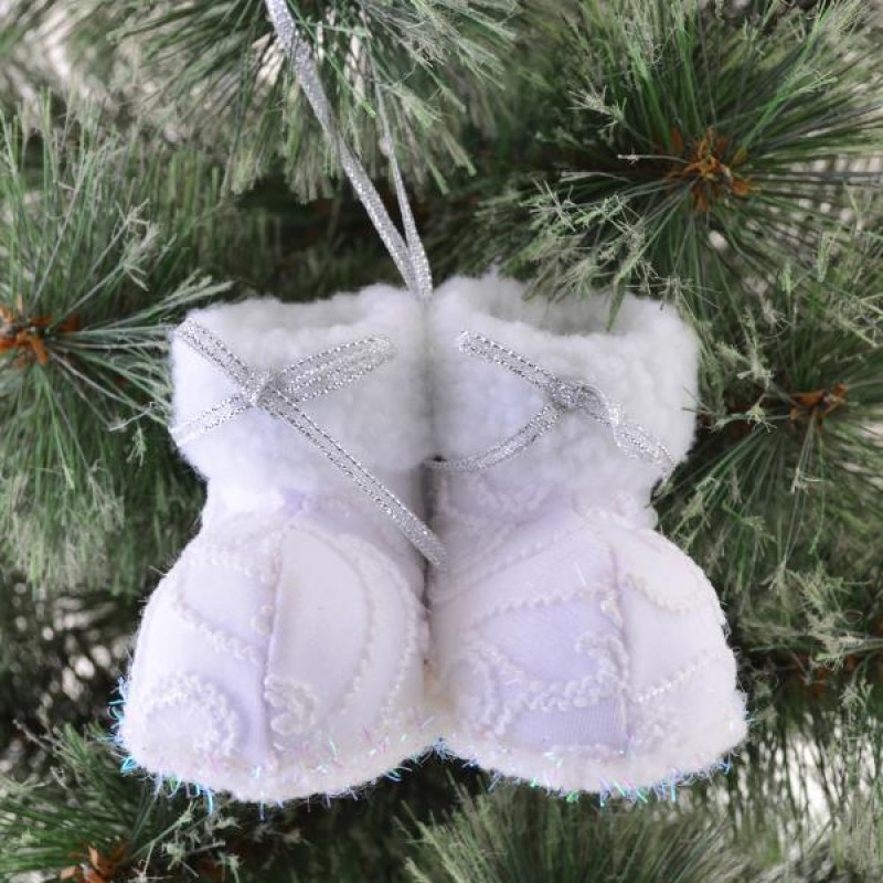 Білосніжна новорічна підвіска у формі декоративних чобіток призначена для декорування ялинки, доповнює інші святкові елементи декору. Розмір: 7х10 см. Склад: пінопласт, поліестер. Упаковка: хедер, полібег.