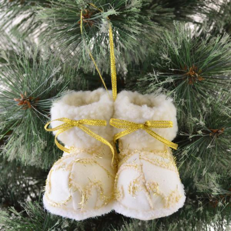Оригінальна новорічна підвіска у формі декоративних чобіток призначена для декорування ялинки, що доповнює інші святкові елементи декору. Розмір: 7х10 см. Склад: пінопласт, поліестер. Упаковка: хедер, полібег.