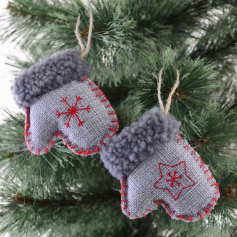 Оригінальна новорічна підвіска у формі декоративної рукавиці, виготовлена в гармонійному поєднанні червоно-сірих кольорів, призначена для декорування ялинки, доповнює інші святкові елементи декору. Розмір: 9х8 см. Склад: поліестер, бавовна. Упаковка: хедер, полібег.