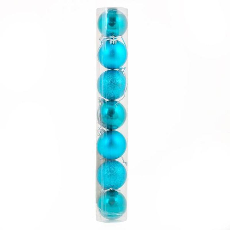Набір ялинкових кульок використовується для прикрашання новорічної ялинки, хвойних гілок і декоративних композицій. Колір: блакитний (мікс покриттів: матовий, глітер, перламутр). Матеріал: пластик. Кількість в упаковці: 7 шт. Діаметр: 5 см.
