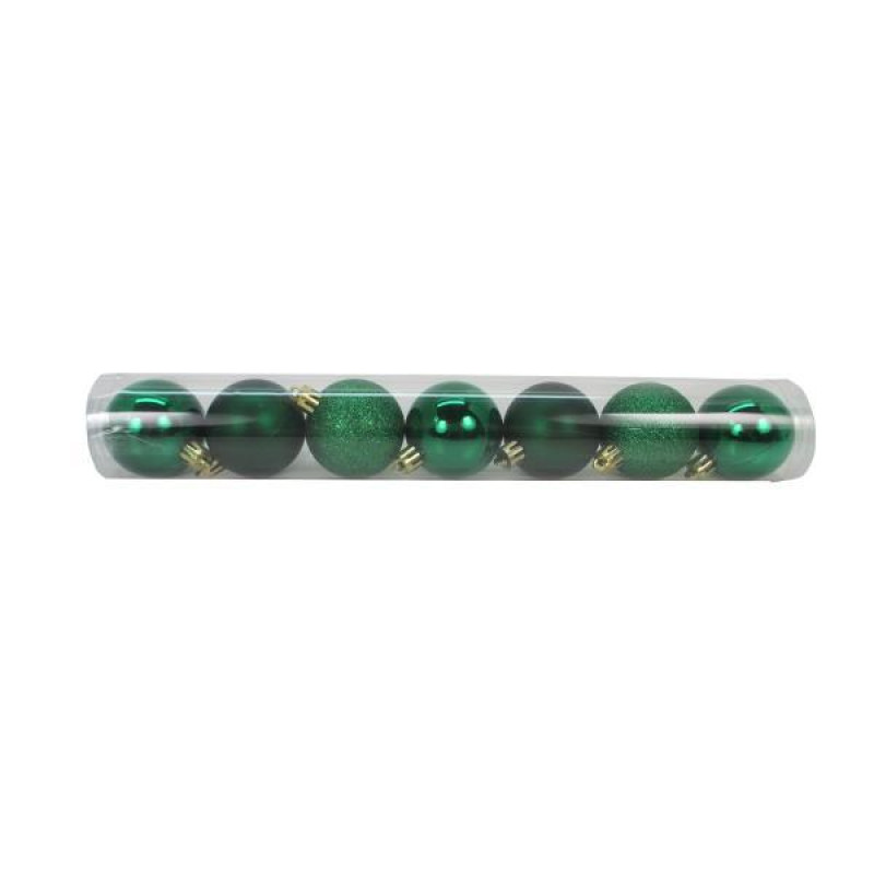Набір ялинкових кульок використовується для прикрашання новорічної ялинки, хвойних гілок і декоративних композицій. Колір: зелений (мікс покриттів: матовий, глітер, перламутр). Матеріал: пластик. Кількість в упаковці: 7 шт. Діаметр: 5 см.