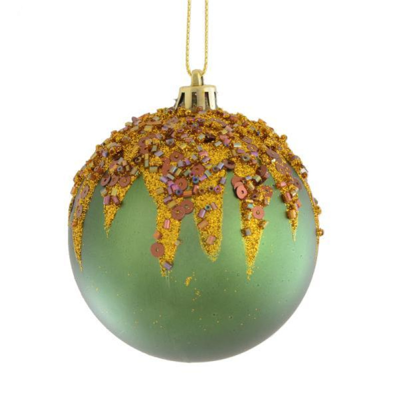 Яскрава куля, прикрашена блискітками, глітером та бісером, використовується для прикраси новорічної ялини, хвойних гілок та декоративних композицій. Матеріал: пластик. Діаметр: 8 см.
